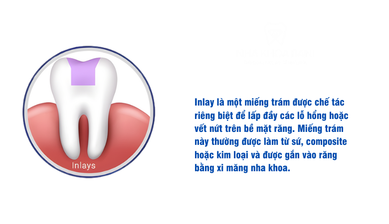 Inlay là một miếng trám được chế tác riêng biệt để lấp đầy các lỗ hổng hoặc vết nứt trên bề mặt răng. Miếng trám này thường được làm từ sứ, composite hoặc kim loại và được gắn vào răng bằng xi măng nha khoa. Inlay thường được sử dụng cho các trường hợp răng bị sâu hoặc nứt nhưng chưa ảnh hưởng đến múi răng.