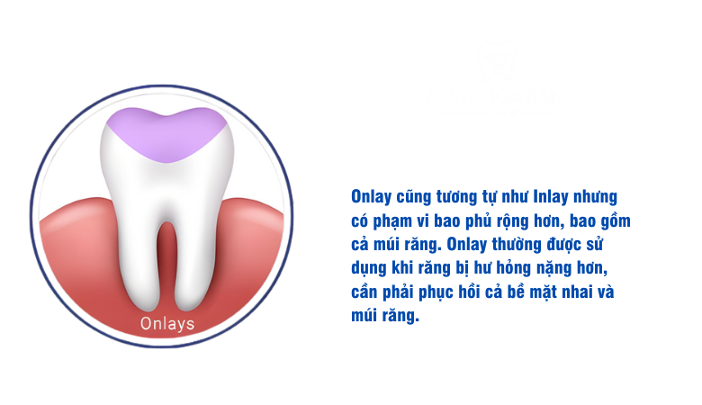 Onlay cũng tương tự như Inlay nhưng có phạm vi bao phủ rộng hơn, bao gồm cả múi răng. Onlay thường được sử dụng khi răng bị hư hỏng nặng hơn, cần phải phục hồi cả bề mặt nhai và múi răng.